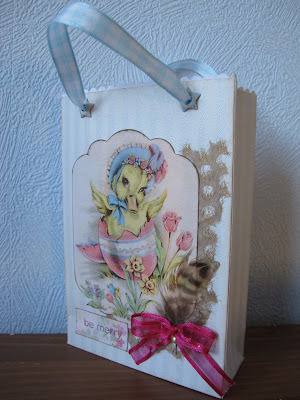 Nyt pääseekin It's all about the vintage and beauty -haasteessa tekemään välillä muutakin kuin kortteja! Haasteena on nimittäin lahjapussukka. Minä tein omani vaaleansiniraitaisesta tapetista valmiista paperipussista mallia katsoen ja pääsiäisaiheella. Ripustusnauhat laitoin gessolla hillitymmiksi värjätyillä sirkkarenkailla vahvistettuihin reikiin. Sekä kapea siniruutuinen että leveä ruskearuutuinen nauha ovat Fantastic Ribbonsilta. Kuva on tulostettavissa esim. Vintagearkusta. Revin reunat ja värjäsin ne seepian värisellä musteella, kuten myös pussin kulmat ja keltaisen ruusun reunoja.Siniset kukkaset taas värjäsin hillitymmiksi gessolla. Kuvan alakulmaan keksin kiinnittää kaksi munanmuotoista chipboard-kirjainten aukoista jäänyttä palaa ja ruskean untuvan pehmusteeksi.